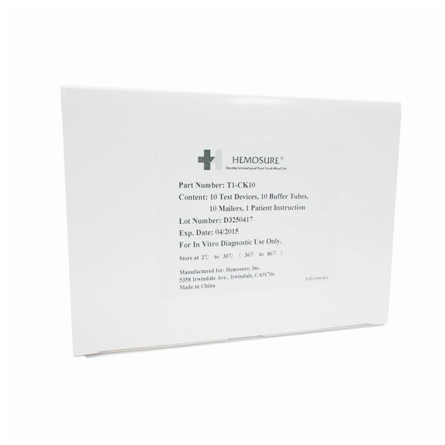 CLIA Complexity: WaivedCPT Codes: G0328QW (colorectal cancer screening); 82274QW (detection of blood in feces form)Sensitivity: 50ng hHB/mLSpecificity: over 96%Useful aid in the diagnosis and therapy of gastrointestinal disordersPatient-friendly for use in physicians' offices, labs, hospitals, clinics, or homesAs test sample flows up through absorbent device, the labeled antibody-dye conjugate binds to the hemoglobin in specimen, forming an antibody-antigen complexResults within five minutesPositive results: one band in the control (C) region, one band in the test (T) regionNegative results: only one band in the control (C) regionLow false positive resultsReaction components: citric acid, monoclonal and polyclonal antibody, mouse anti-HB antibodies 1 and 2, and goat anti-mouse IgG antibodyIf home kit mailers are not needed, they can be excluded from the order. Please contact your Fisher HealthCare account manager for details.Order InfoThe 10-test kit contains 10 collection bottles and 10 home kit mailers; 30-test kit contains 50 collection bottles and 50 home kit mailers.