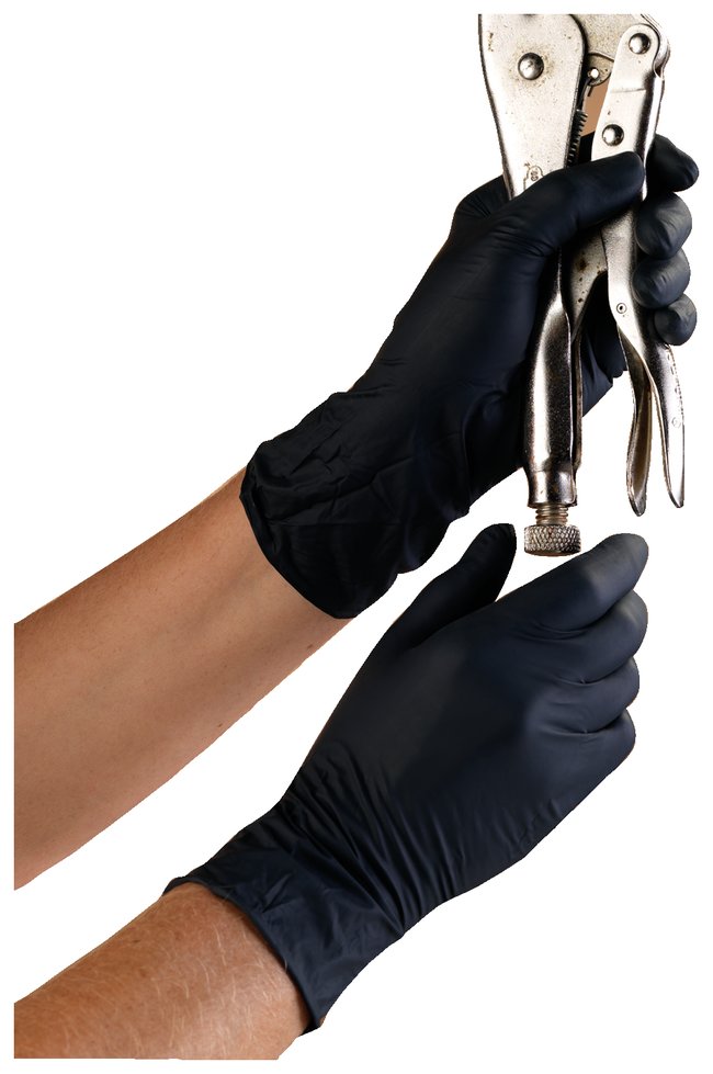 Black medical grade gloves mask dirt and stains. Textured fingertips offer a secure grip when handling tools and materials.