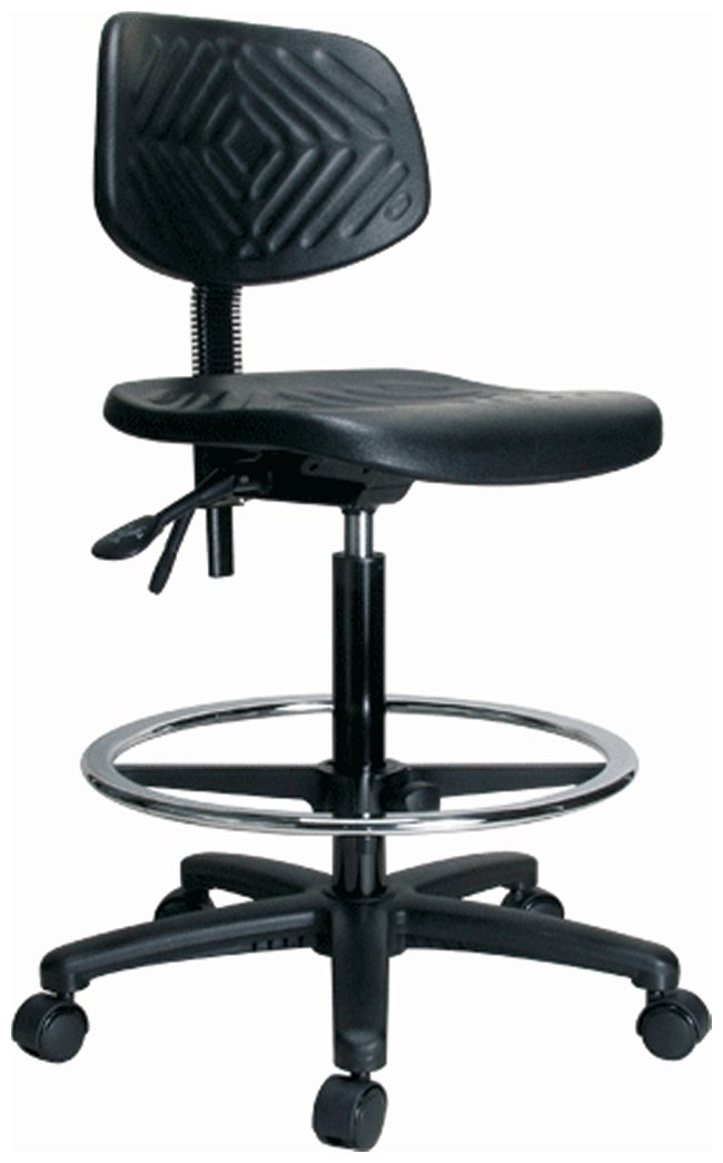 Polyurethane Chair - High Bench Height with Seat Tilt, Chrome Foot Ring, and Casters in Black Polyurethane, Each