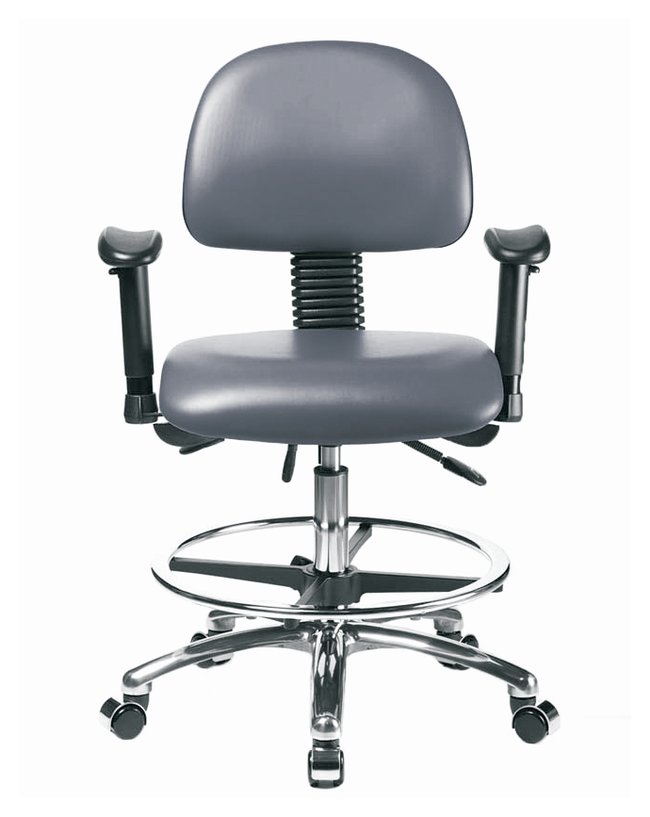 Fisherbrand™ Vinyl Chairs in Chrome are height adjustable for 36 in. work surfaces and feature ergonomic adjustments, adjustable arms, chrome adjustable foot ring, and self-braking casters. Antibacterial/Antifungal Grade B vinyl in a variety of colors will suit any work space.