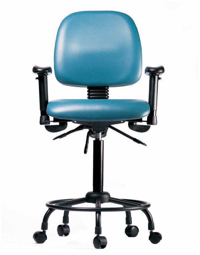 Fisherbrand™ Vinyl Chairs with Medium Back and Round Tube Base is height adjustable for 36 in. work surfaces and feature ergonomic adjustments, fixed foot ring, adjustable arms, and self-braking casters. Antibacterial/Antifungal Grade B vinyl in a variety of colors will suit any work space.