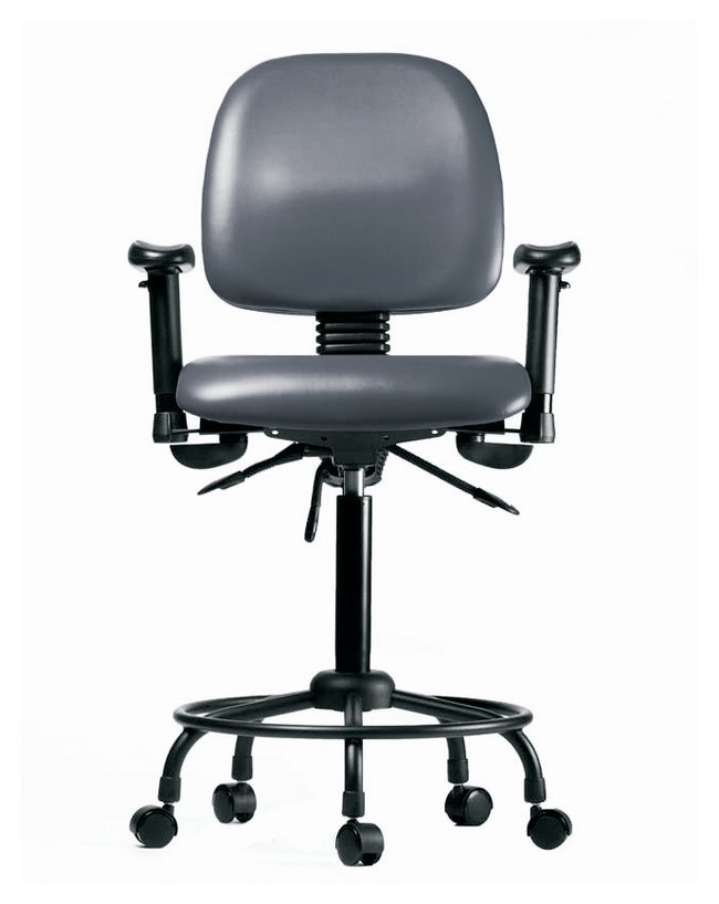 Fisherbrand™ Vinyl Chairs with Medium Back and Round Tube Base is height adjustable for 36 in. work surfaces and feature ergonomic adjustments, fixed foot ring, adjustable arms, and self-braking casters. Antibacterial/Antifungal Grade B vinyl in a variety of colors will suit any work space.