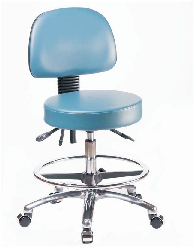 Fisherbrand™ Vinyl Stools with Back in Chrome are height adjustable for 36 in. work surfaces and feature ergonomic adjustments, adjustable chrome foot ring, and self-braking casters. Antibacterial/Antifungal Grade B vinyl in a variety of colors will suit any work space.