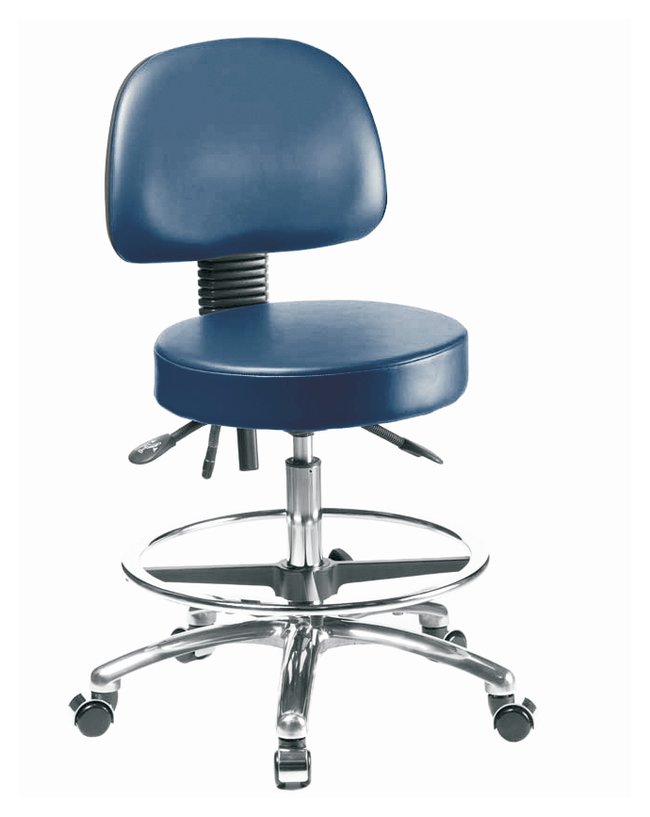 Fisherbrand™ Vinyl Stools with Back in Chrome are height adjustable for 36 in. work surfaces and feature ergonomic adjustments, adjustable chrome foot ring, and self-braking casters. Antibacterial/Antifungal Grade B vinyl in a variety of colors will suit any work space.