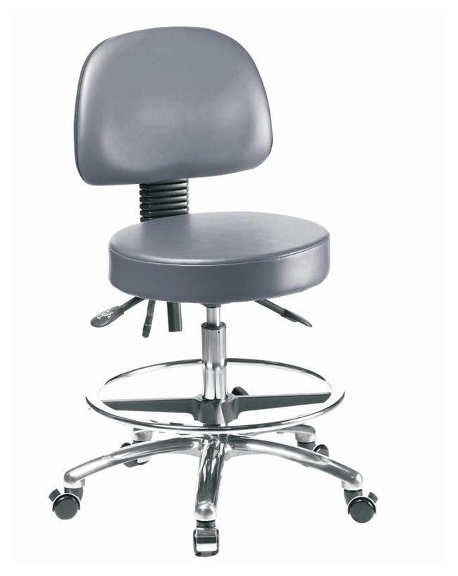 Fisherbrand™ Vinyl Stools with Back in Chrome are height adjustable for 36 in. work surfaces and feature ergonomic adjustments, adjustable chrome foot ring, and self-braking casters. Antibacterial/Antifungal Grade B vinyl in a variety of colors will suit any work space.