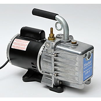 Specifications Two Stage: Produces 25 micron ultimate Pressure Rotary Sliding Vane: Provides 85 liter per minute (3cfm) capacity and operates quietlyDirect Drive: Reduces space neededGas Ballast: Helps purge moisture from vacuum system Trap: Reduces risk of oil sucked back into the systemThis direct drive pump provides the best Performance/Cost Ratio available today. Comes complete with initial supply of High Vacuum Pump Oil. Ready to OperateOur reliable, rotary vane type, low cost two-stage high vacuum pump operates quietly. Available in 3cfm (cubic feet per minute), 5cfm, 7cfm, 10cfm. All pumps are also available in 220V. The motor is ½ horepower and features 1725 RPM. The hose barb is 3/8” OD for 3/8” ID tubing on the 3cfm and 5cfm models and 1/2” OD for 1/2” ID tubing on the 7cfm and 10cfm. Operating temperature is 30º F to 170ºF. Ideal for use with vacuum ovens, bell jars, desiccators, and many more applications. Pumps achieve an ultimate vacuum of 25 microns in laboratory conditions.Tubing with 2ea. hose clamps, 1/2 "ID. For use with all Fischer Technical "LAV " series high vacuum pumps.High Vacuum Pump Oil Designed specifically for use with Fischer Technical Company High Vacuum Pumps. This non-detergent high vacuum pump oil is hydro processed to attain its stable, viscous and refined properties. This process also results in a clear mineral oil that will alert of contamination sooner if the oil becomes milky or cloudy.High Vacuum Grease This vacuum grease helps provide a proper seal between the vacuum pump plate and the bell jar so that high vacuum pressures can be achieved. "The Tank " Oil Change System All vacuum pumps require changing oil after every use. Contaminated oil, laden with moisture and acid will damage pumps and shorten pump life. On top of that, deep vacuums cannot be achieved with contaminated oil. Maintaining clean oil in your pump will ensure that your pump will operate at peak efficiency. No More Mess & Spills Environmentally Friendly! The Tank is Easy to Use: Turn black cap counterclockwise to open. Place vacuum pump in the cradle and drain pump. Once the pump has finished draining, turn the black cap clockwise to close after every use. Holds up to 5 oil changes.Vacuum Gauge and Fittings Bourdon tube vacuum gauge and fittings to add to your Fischer Technical company LAV series high vacuum pumps. Ships complete with gauge, fittings, and sealant.High Vacuum Pump With Gauge These rotary style, 2 stage direct drive pumps are ideal for use in the laboratory in virually all applications where a vacuum of up to 25 microns is desired. The pumps use High Vacuum pump oil (one quart included) and are designed to run on a closed system. The vacuum should not be regulated, but rather these pumps should be used with vacuum ovens, desiccators, etc where a consistent, high vacuum is required. Regular oil changes and proper maintenance will ensure these pumps will last for years in your laboratory. High Vacuum Pump, 110V, 60Hz with 0-30 " Bourdon Tube Type Gauge, 1/2HP, TESTED TO 25 MICRON ULTIMATE VACUUMGeneral Repair Kit For Lav-3 Pumps This repair kit includes all the essential items which may require replacement when performing a general maintenance on the LAV series high vacuum pumps. The kit includes 1ea. PR-3 (Shaft Seal), 1ea. PR-311 (Cover Seal), 1ea. PR-208 (Flexible Coupler), 1ea. PR-18 (Cartridge Valve), 2ea. OIL-001 (Quart of OIL)Flexible Coupler For Lav-3 Pumps Replacement Flexible Coupler for Fischer Technical 3cfm pumpsFree Air Displacement:85 LPM (3.0 CFM)Ultimate Vacuum:1-micron laboratory conditions/better than 25 microns field conditionsPump Speed:1725 RPMOil Capacity:27oz. (785cc)Operating Temperature:30 to 170°FVacuum Tubing Required:3/8” OD for 3/8” ID TubingDimensions (W x L x H in.):11” H x 14” L x 5 ¼” W (27.5cm x 35CM x 12.5cm)Weight:30 lbs.
