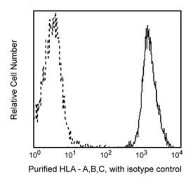 Reacts with a monomorphic epitope of major histocompatibility Class I antigens widely distributed on human nucleated cells. This antibody is routinely tested by flow cytometric analysis. Other applications were tested at BD Biosciences Pharmingen during antibody development only or reported in the literature.