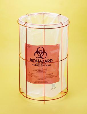 Poxygrid* Bag Holder^ Sturdy wire holder for biohazard bags. Separate hooked ring rests over top to keep bag in place. Circular shape. Made from bright biohazard orange colored epoxy-coated wire. Diameter: 37cm. Height: 60cm. Fits bags 61x76cm.