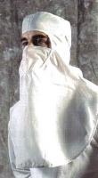 B-Fore* Pullover Hoods^ Complete head coverage. Extra-long shoulder drape fits well into coverall or frock, preventing pullout. Elastic take-up in back with horizontal and vertical snaps for adjustment. Sewn-in replaceable over the nose 2-ply poly tricot facial. Color: White. Size: X-Small.