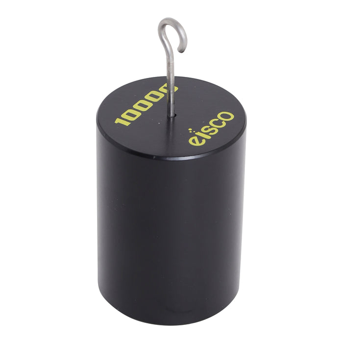 Solid Iron Hooked Weight 1000 grams (2.2 pounds), Hook is free to move and hooks on both sides for additional weights to be connected. Weight is painted black with yellow weight amount identifier. Weight is cylindrical and has a diameter of 50mm (1.96" ) and is 67 mm tall (2.64") This weight has a bored hole through the weight to allow for a moving double hook to sit flat if need be.