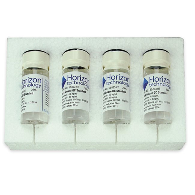 Oil & Grease Standards in multi use glass vials. Simply pipete 5 ml of solution into the extraction vessel. Each vial contains 26 ml of 40 mg Stearic Acid and n-Hexadecane solution, for a total of 5 uses per vial.