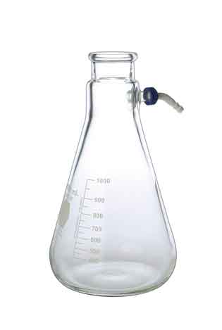 KIMAX® heavy wall filter flasks have a quick-release connector designed as a safety feature. Hose barb accommodates 1/4 inch ID tubing, Tubing can remain permanently attached since the opposite end is designed to be easily assembled via a positive threaded seal, Proper positioning of the connector provides greater flask stability, as tubing angled downward has less tendency to tilt the flask, Flasks are designed for vacuum to 29” of mercury, made with a heavier wall than a standard Erlenmeyer flask