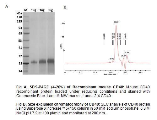 Recombinant CellExp* CD40 50ug^ Recombinant CellExp* CD40, Source HEK 293 cells, Species: Human, Purity by SDS-PAGE > 95%, Synonyms: CD40LG,CD154, CD40L, HIGM1, IGM, IMD3, T-BAM, TNFSF5, TRAP, gp39, Size: 50ug