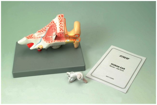 This hand painted human ear model is highly detailed and enlarged 2 times. It dissects into 3 parts showing external, middle and inner portions of the ear. Ossicles and labyrinth can be taken out. The model comes on a base, numbered, with a key card.