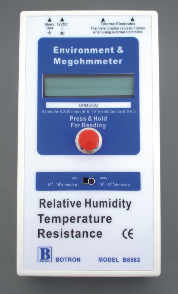 Humidity And Temperature Audit Kit^ Humidity And Temperature Audit Kit, Display: Lcd Digital, Temperature: 320-1000 F, Test Voltage: 10 And 100 Volts, Test Range:, 10 Raised To 3 - 10 Raised To 12, Battery: 9 V, Ground Leads: Two, Size: 4In X 7.5In X 1.25In, Parallel Probes On Back, 2 Ground Lead