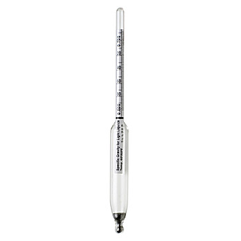 Specifications These plain form hydrometers are available in a variety of models measuring specific gravity / relative density (g/cm3) of liquids lighter and heavier than water in various ranges from 0.690 to 2.000.Commonly used in industries such as food and beverage, chemical, pharmacology, transportation, refrigeration and moreLead free ballast and glassIndividually serializedTemperature standardization: 60°F (15°C) Hand inspected by our U.S. quality teamPackaged with a multi-language (English, French, German, Italian, Portuguese, and Spanish) Statement of Accuracy indicating accuracy traceable to NISTNote: Hydrometers should be stored in a clean, dry, safe place, and should not be subjected to extreme temperatures.For Liquids Heavier Than WaterThomas No.RangeDivisionsLengthAccuracy1199K921.000/1.2200.002300mm (11.8 ")±0.0026025C791.200/1.4200.002300mm (11.8 ")±0.0026025C831.400/1.6200.002300mm (11.8 ")±0.0026025C871.600/1.8200.002300mm (11.8 ")±0.0016025C911.000/1.6000.005300mm (11.8 ")±0.0016025C951.000/2.0000.01300mm (11.8 ")±0.0016025C991.500/2.0000.005300mm (11.8 ")±0.0056025D031.800/2.0000.002300mm (11.8 ")±0.0051234K711.400/1.6500.005165mm (6.5 ")±0.0051234K721.600/1.8500.005165mm (6.5 ")±0.0051234K731.800/2.0000.005165mm (6.5 ")±0.0056025C551.000/1.2500.005165mm (6.5 ")±0.0056025C591.200/1.4500.005165mm (6.5 ")±0.005For Liquids Lighter Than WaterThomas No.RangeDivisionsLengthAccuracy6025C310.700/0.8100.001330mm (13 ")±0.0016025C350.800/0.9100.001330mm (13 ")±0.0016025C390.900/1.0000.001330mm (13 ")±0.001