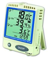 Minimum/maximum feature displays the highest and lowest readings for any time period. The alarm feature sounds and flashes a bright red LED when temperature, humidity, and/or dew points rise above or fall below user-set trip points. Alarm settings can be adjusted in 0.1 increments. A unique 4-line display simultaneously shows ambient temperature, humidity, dew point, and time of day.