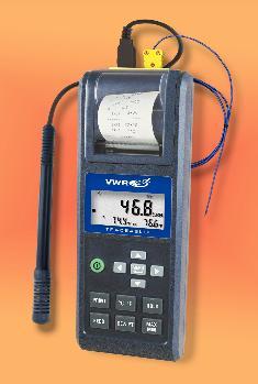 Temperature Range: -20°C to 60°C (-4°F to 140°F) for humidity/temperature probe, -200°C to 1333°C (-328°F to 2431°F) for Type K probe. This device provides a permanent record by printing current humidity, temperature, dew point, time, and date. The triple display features 9.5mm high LCD digits that continuously and simultaneously show humidity, temperature 1, and temperature 2.