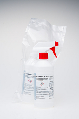 HYPO-CHLOR* Cleanroom Formula^ For pharmaceutical and biotechnology labs. One-step, ready-to-use product with premixed concentrations of 5.25% sodium hypochlorite and USP purified water. Aseptically filtered to 0.2u, double-bagged. Lot-specific Certificates of Analysis. Sterility Report. 473mL.