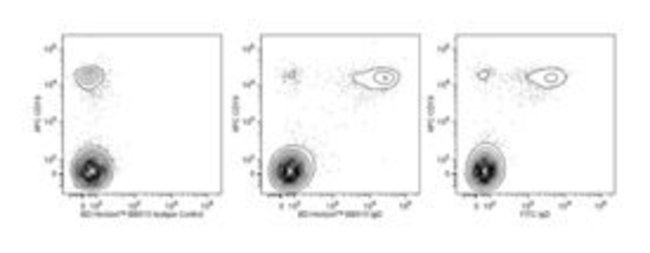 The IA6-2 monoclonal antibody specifically binds to the heavy chain of human Immunoglobulin D (IgD). IgD is a member of the immunoglobulin superfamily that exists in type 1-membrane (mIgD) and soluble glycoprotein forms. mIgD is expressed on mature naοve B cells (along with membrane IgM) and serves as a B-cell receptor for antigen (BCR). In response to antigen binding, the mIgD BCR, in association with other signaling molecules including CD79a and CD79b, can transduce activating or tolerizing signals intracellularly into B lymphocytes. The antibody was conjugated to BD Horizon BB515 which was developed exclusively by BD Biosciences. With an excitation max of 490nm and an emission max of 515nm, BD Horizon BB515 can be excited by the 488nm laser and detected in a standard FITC set (e.g. 530/30-nm filter). This dye provides a much brighter alternative to FITC with less spillover into the PE detector.