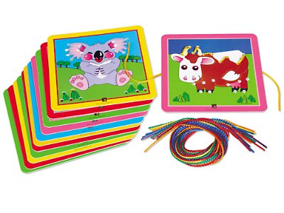 Building eye/hand coordination and fine motor control is more fun than ever…with kid-pleasing picture cards children love to lace! Each cute card is made of indestructible plastic, so children can lace them again and again. Kids just thread the laces right through the holes…and complete each adorable picture! 12 cards and 12 laces; cards are 6 1/4".