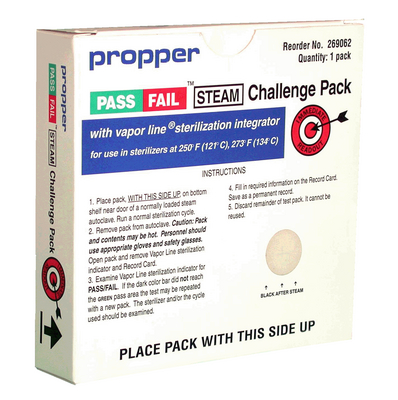 Indicator^ Pass/Fail Process Challenge Packs are preassembled single-use PCD containing an instant-readout Class 5 Integrator equivalent in performance to a biological indicator in the AAMI approved linen pack. The instant readout indicator allows for immediate release of non-implant loads