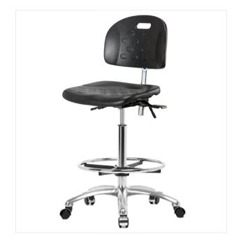 Industrial Clean Room Polyurethane High Bench Height Chair with Chrome Base, No Tilt, Adjustable Arms, Chrome Foot Ring, Glides, Each