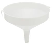 Industrial Funnel, Polyethylene^ Heavy-duty, extra large industrial funnel is constructed of linear polyethylene. Top O.D. is approximately 343mm. Stem length is approximately 127mm, tapering to an approximate 32mm I.D. opening at the bottom of the stem.