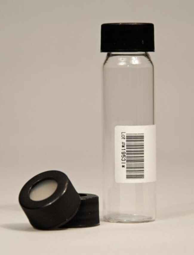 Pre-cleaned 40-ml clear glass VOA vial with 24-414 open-top septum cap. Barcoded label on vial referencing Lot Number. 288 vials per case (4 x 72).