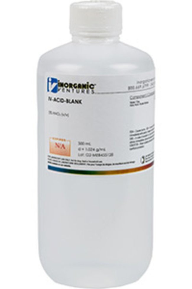 Inorganic Ventures' 5% (v/v) Nitric Acid Blank is a 500mL reference material set in a nitric acid matrix for stability. This ICP blank is Traceable to NIST and manufactured in accordance with our stringent Quality Assurance guidelines. One year Expiration Date.