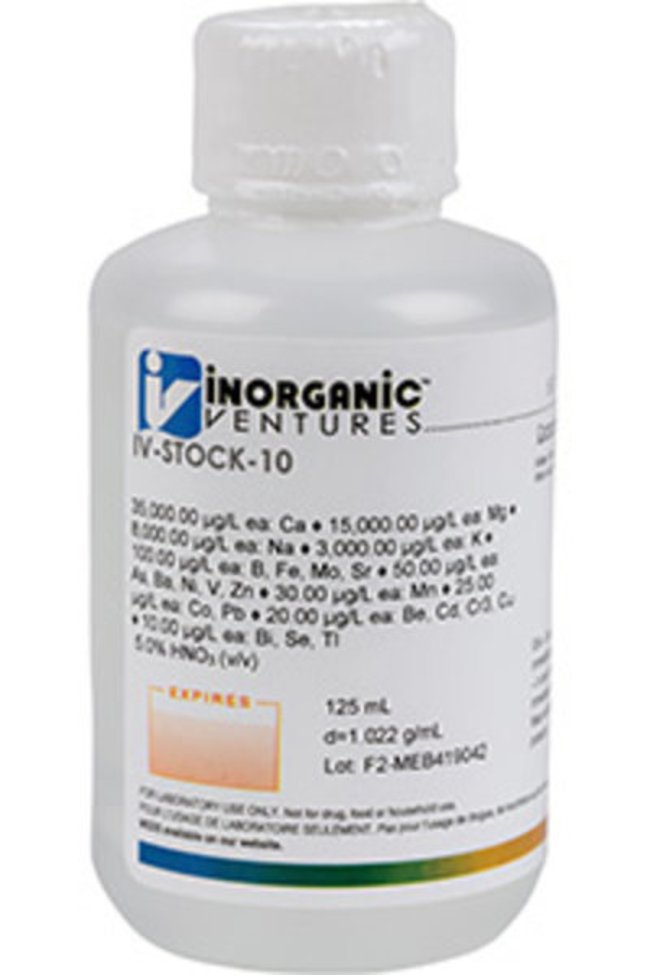 Inorganic Ventures' ICP Calibration Standard - Surface Water is a 125mL certified reference material set in a nitric acid matrix for stability. This standard is Traceable to NIST and manufactured in accordance with our stringent Quality Assurance guidelines. One year Expiration Date.