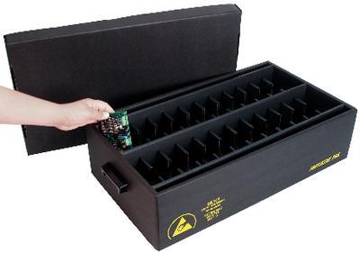 ESD In-Plant Handler^ Made of impregnated corrugated material. Buried shielding layer minimizes sloughing and rub-off contamination. Static-dissipative surface: 1e7-1e9 ohms/sq. 100% recycled material. Box dimensions: 58.1Lx32.7Wx38.7Hcm. 5 cells. Cell dimensions: 38.7Wx51.1Lx5.7cm thick.