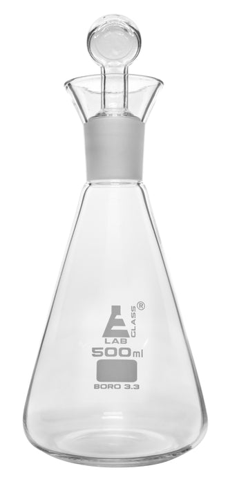 500ml capacity, iodine flask with ground joint and interchangeable stopper made of high quality, heavy duty 3.3 borosilicate glass. Used for iodine value determination. Ungraduated. Socket size 29/32. Flask measures 8" tall and has a base diameter of 4". Eisco Labs Borosilicate glass has the following heat tolerances: Strain Point -515°C | Annealing Point 565°C | Softening Point 820°C.