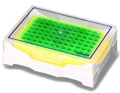 Rack^ IsoFreeze* Color Change, PCR, Maintains a sample temperature of less than 4 degrees C for almost 3.5 hours, color change racks have a dramatic change to a contrasting color at 7 degrees C, Cold Temperature: Green, Warm Temperature: Yellow, Dimensions: 70 x 105 146mm. Polypropylene.
