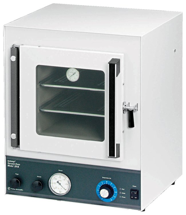 Standard capacity vacuum oven10 in. wide (25cm), 1000-watt wraparound element completely covers top, sides and bottom of oven chamberOperating FeaturesCapacity: 0.65 cu. ft. (0.02m3)Dial-in temperatures up to 280°C (536°F)Maintains 30 in.Hg (762mm) vacuum with less than 1/2 in.Hg (12.7mm) loss per dayAutomatic temperature backup control takes over if the temperature rises more than 5°C over setpoint; constancy ±1.0°C at ultimate vacuum; control sensitivity ± 1.0°C; warning light alerts of failureCabinet FeaturesFull-view window permits continuous monitoring18-gauge steel cabinet is protected by chemical-resistant enamel with 4 in. thick (10cm) fiberglass insulationLow-temperature handle and silicone door gasketSeparate inlet and outlet connectors/controls allow replacement of air with inert gasThis product(s) resides on a Fisher Scientific GSA or VA contract. If you are viewing this page as a nonregistered user, the price(s) displayed is List Price. To view your GSA or VA contract pricing, log in using your account number, or become a registered user by contacting one of our Customer Service teams. You can also view your contract price by searching for this item(s) on GSA Advantage. To place an order, contact Fisher Scientific Customer Service.Order InfoCapacity: 0.67 cu. ft. (0.018m2)Shelf and floor area: 313 sq. in. (2019cm2)Chamber: 11.5D × 10W × 10 in.H (29 × 25 × 25cm)Exterior: 17 3/4L × 18W × 22 3/4 in.H (45 × 46 × 58cm)Shipping weight, 90 lb. (41kg)Service PlanService agreement available.Warranty and ServicesOne year parts, labor and travel