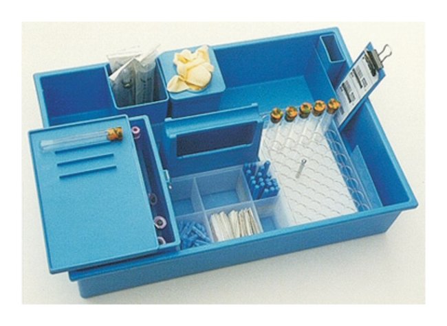 Blue autoclavable polypropylene with centered handleL x W x H: 17.375 × 11.625 × 4 in. (44.1 × 29.5 × 10.2cm)Large Tray Unit for 65 Tubes (Cat. No. 22-038-460) Packet holder for 65 vac tubes Gauze box Accessory box Supply box Glove holderMini utility box Isolation box with two needle holders, hold 32 vac tubes eachPaperwork compartment along side of trayPen holder ClipboardLarge Tray Unit for 40 Tubes (Cat. No. 22-038-441)44-well test tube rack Packet holder Accessory box Supply box Glove holder Isolation box with supply organizer for 42 vac tubesPaperwork compartment along side of tray Pen holder Clipboard