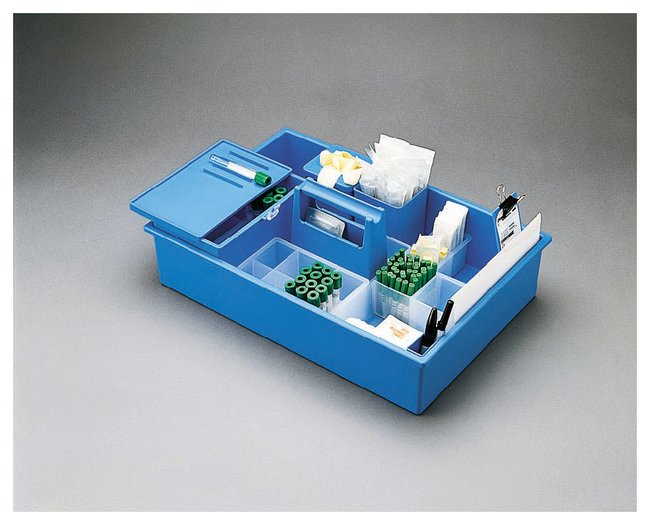 Blue autoclavable polypropylene with centered handleL x W x H: 17.375 × 11.625 × 4 in. (44.1 × 29.5 × 10.2cm)Large Tray Unit for 65 Tubes (Cat. No. 22-038-460) Packet holder for 65 vac tubes Gauze box Accessory box Supply box Glove holderMini utility box Isolation box with two needle holders, hold 32 vac tubes eachPaperwork compartment along side of trayPen holder ClipboardLarge Tray Unit for 40 Tubes (Cat. No. 22-038-441)44-well test tube rack Packet holder Accessory box Supply box Glove holder Isolation box with supply organizer for 42 vac tubesPaperwork compartment along side of tray Pen holder Clipboard
