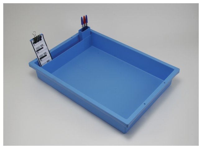 Blue, autoclavable polypropylene With or without overhead handle L x W x H: 15 × 10.625 × 3 in. (38.1 × 27 × 7.6cm)