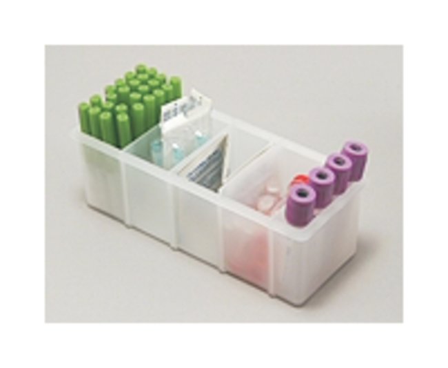 Holds small supplies as well as 42 vac tubesAutoclavable, translucent polypropyleneFive compartmentsFour removable dividersMeasures 6.6875 × 2.5 × 2.375 in. (17 × 6.4 × 6cm)