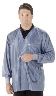 Hallmark OFX-100 Jacket^ With grid-knit ESD cuffs that ground. Standard ground cord connects to a 4mm male snap at either hip pocket. Fabric is breathable; contains 13% carbon. Manufacturer guarantees sleeve-to-sleeve continuity for a minimum of 100 washes or two years. Blue. X-Small.