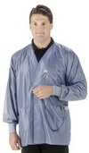 Hallmark OFX-100 Jacket^ With grid-knit ESD cuffs that ground. Standard ground cord connects to a 4mm male snap at either hip pocket. Fabric is breathable; contains 13% carbon. Manufacturer guarantees sleeve-to-sleeve continuity for a minimum of 100 washes or two years. Blue. XX-Large.