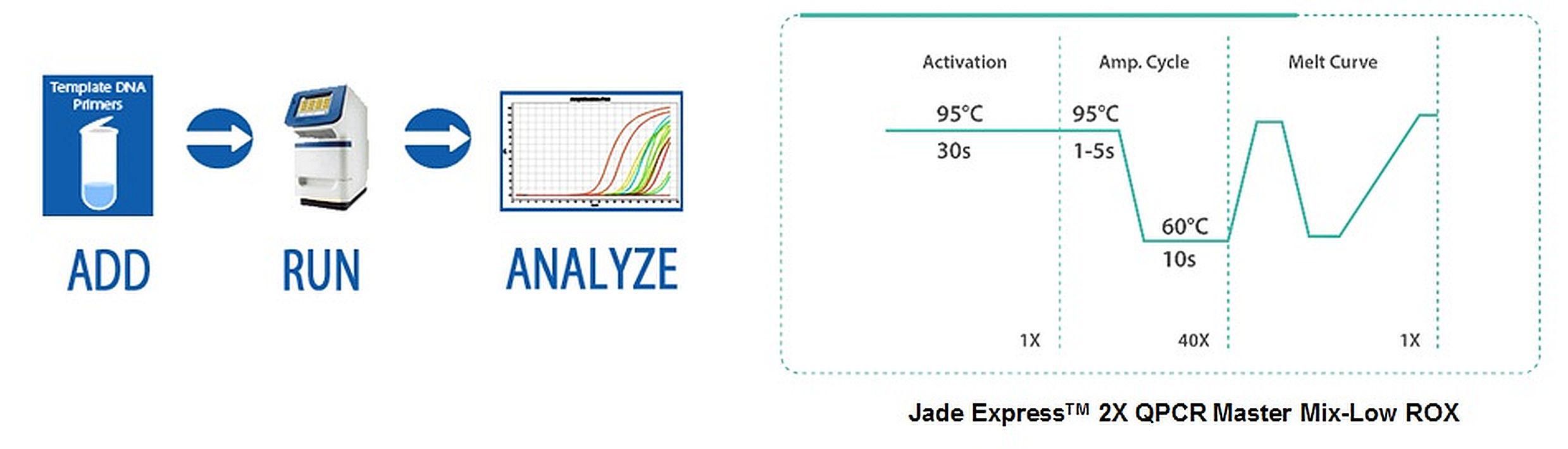 Jade Express* Mix-Low Rox 4 X 1.25 ml^ Jade Express* Mix-Low Rox, 2X QPCR, for performing quantitative PCR (real-time analysis) of DNA samples, in a premixed and optimized format. Designed specifically for the aforementioned niche of application, Gene-expression analysis, Size: 4 X 1.25 ml