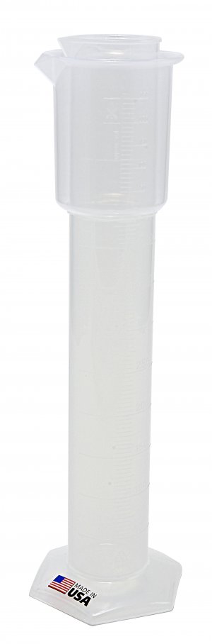 Translucent polypropylene 500 ml hydrometer cylinder with overflow cup. Molded graduations.