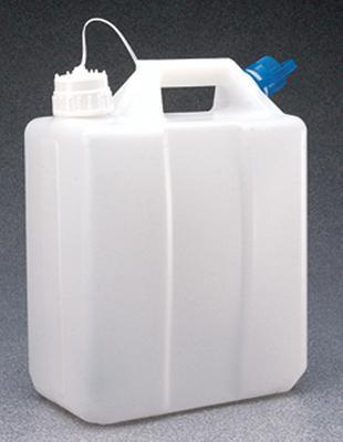 NALGENE* High-Density Polyethylene Jerrican^ 15L, break-resistant container for hard use. Features two spouts for accurate pouring and vented pouring, strap-fastened cap, molded in graduations, and low center of gravity for added stability. 53B and 38-430 polypropylene caps included.