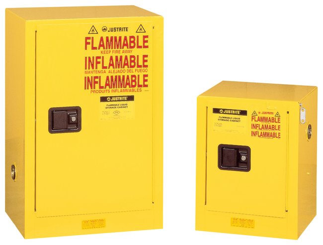 One-door cabinet stores up to 12 gal. (45.4L) of flammablesOne adjustable SpillSlope™ safety shelf directs spills to back and bottom of leakproof sumpFits neatly under counter or stands aloneLettering on door reads: “FLAMMABLE—KEEP FIRE AWAY”High-visibility Haz-Alert™ reflective warning labels provide added safety during power outages or firesFinished inside and out with a durable lead-free hybrid epoxy and polyester powder paint for chemical resistanceCertificationsFM approved. Self-closing models UL listed.ComplianceMeet NFPA and OSHA requirements. Self-closing models comply with Uniform Fire Code.