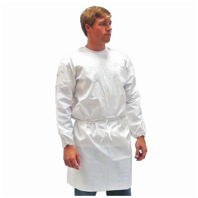 Lightweight composite fabric utilizes microporous film technology to provide excellent protection against hazardous particles and light liquid splash and maintain strength wet or dry.Wraparound style opens to backKnit cuffs or elastic wristsTwo neck ties, two waist tiesNonsterileWhiteOrder InfoFront length: small 38.75 in. (98.4cm), medium 39.75 in. (101cm), large 40.75 in. (103.5cm). Back length of all sizes: 3 in. (7.6cm) longer than frontComplianceMeets ASTM™ F1670 and ASTM F1671 standards.