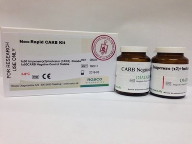 Rapid Carbapenemase Screen: Tablets are used for in vitro screening of carbapenemase producing, bacteria. The method is valid for Enterobacteriaceae and Pseudomonas aeruginosa.Two vials with 6 mm tablets; Imipenem Indicator (CaRB), formulated for maximum stability, each containing 25 tablets equivalent to a total of 50 tests. Call for pricing