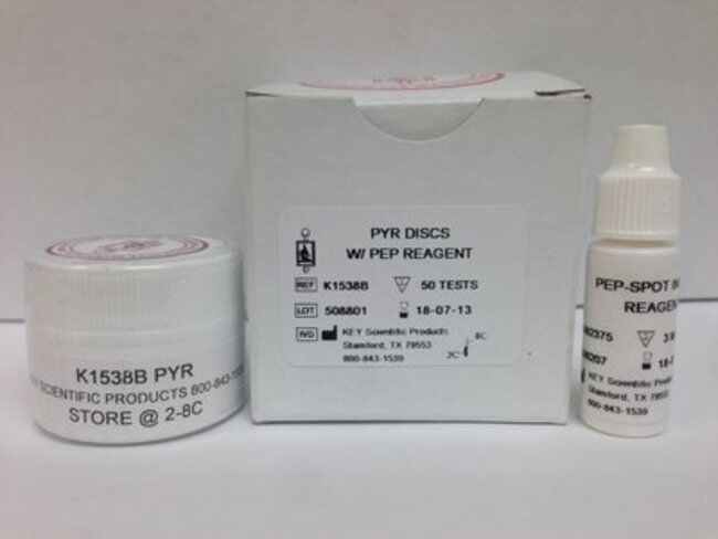 The Pyrrolidonyl Arylamidase (PYR) test is a rapid test which is used for the presumptive identification of group A beta-hemolytic Streptococci and Enterococci. TheEnzymatic hydrolysis of PYR (L-pyroglutamic acid -naphthylamide, aka pyrrolydonyl--naphthylamide) releases free -naphthylamine which is detected and shown by the color change after adding PEP reagent.