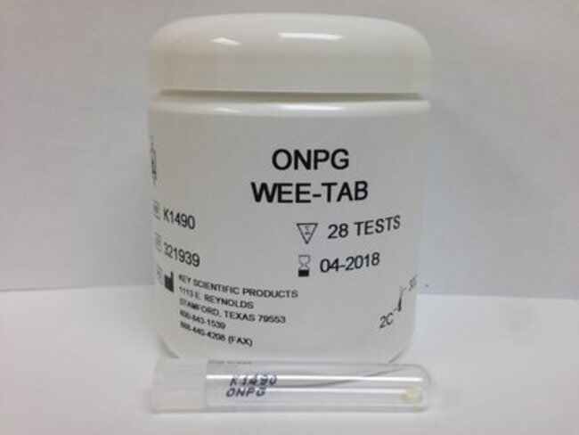 Differentiate slow lactose fermenters and non-fermenters. Demonstration of beta-galactosidase accomplished by hydrolization of substrate that liberates ortho-nitrophenol for a characteristic yellow color. Pack of 28 tablets per tube.