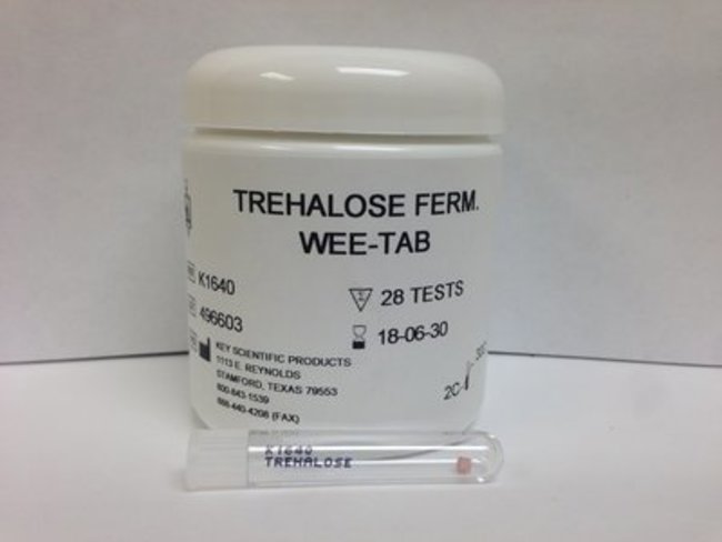 WEE-TAB Trehalose is one of the hard to find rare sugars for fermentation tests which normally have a very short shelf life. They are a cost effective way to keep such tests in stock with minimal waste. The small tubes are packaged 28 per container and take up only 3 inches of shelf space. They are useful for many types of organisms and results are able to be seen in 2-4 hours. They are a cost-effective rapid method to referee MALDI or other ID system for equivocal results.